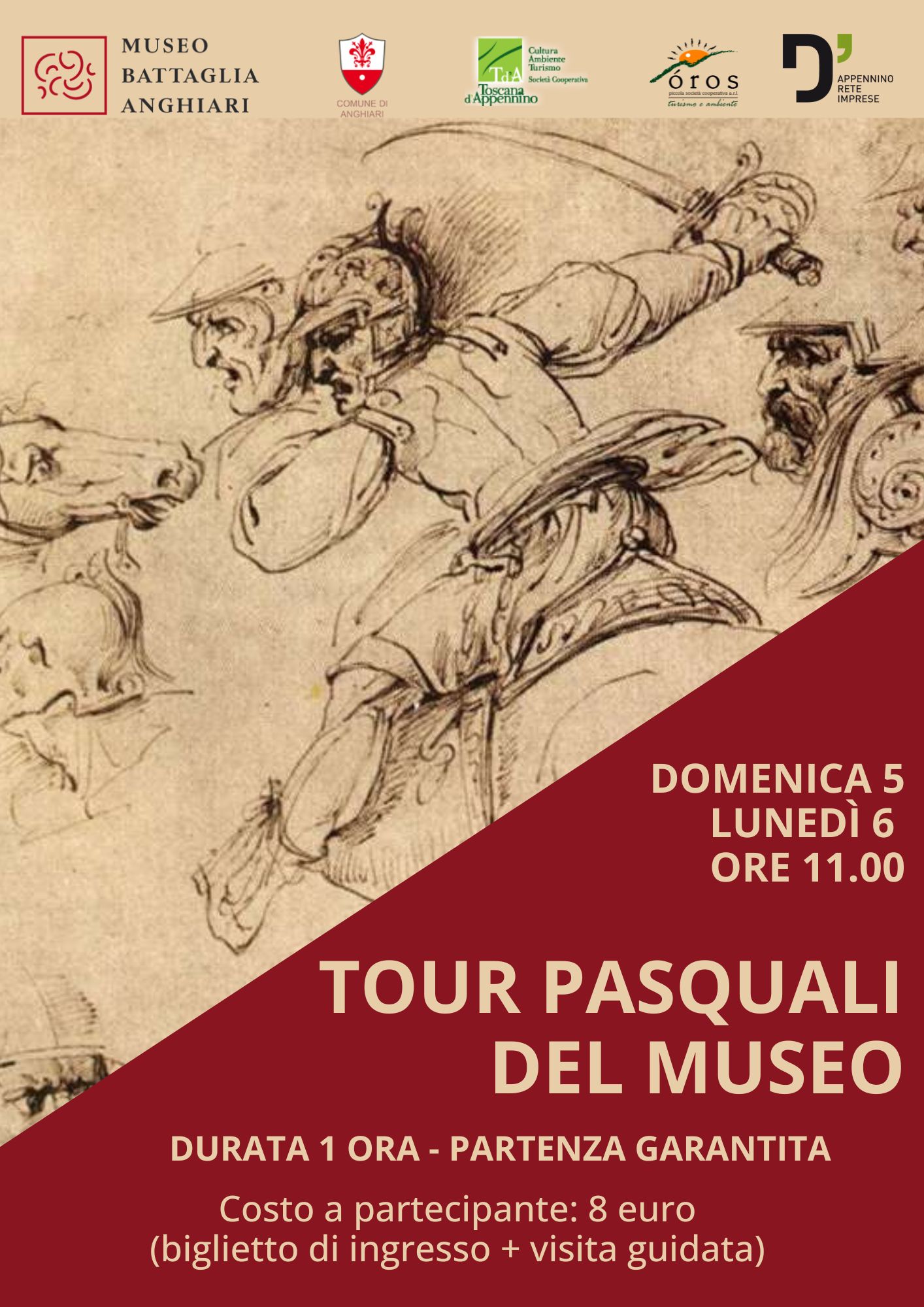 Vi proponiamo due visite guidate per conoscere le bellezze del Museo della Battaglia e di Anghiari anche durante le festività pasquali, ricordandovi che il museo, come di consueto, rimane aperto anche durante i giorni festivi, con orario dalle 10:00 alle 13:00 la mattina e dalle 14:30 alle 18:30 il pomeriggio.